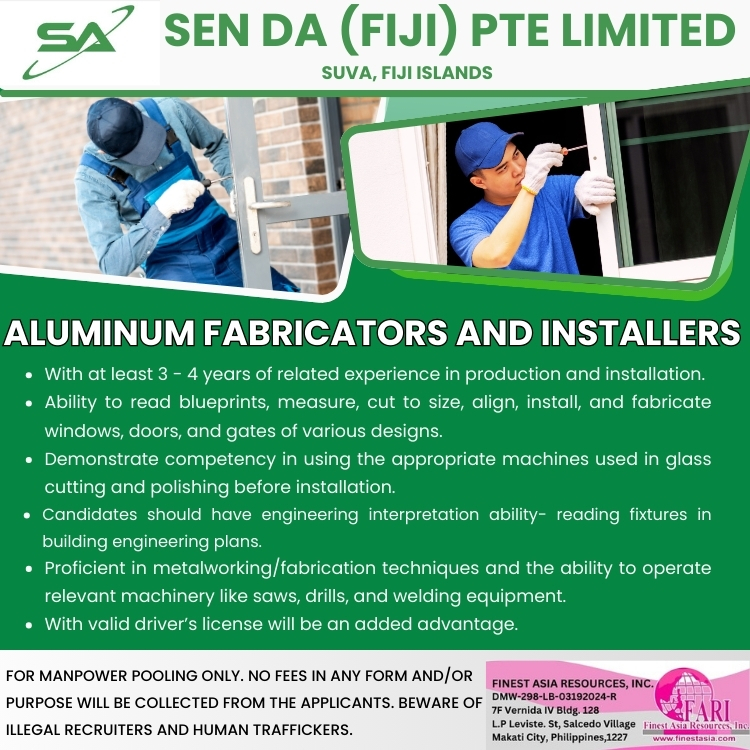 Aluminum Fabricators and Installers for Sen Da (Fiji) PTE Limited Sen Da (Fiji) PTE Limited bound to Suva, Fiji Islands