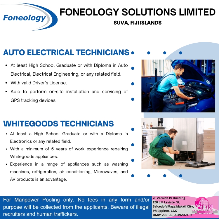 Auto Electrical Technicians / Whitegoods Technicians for Foneology Solutions Pte Limited Foneology Solutions Pte Limited bound to Suva, Fiji Islands