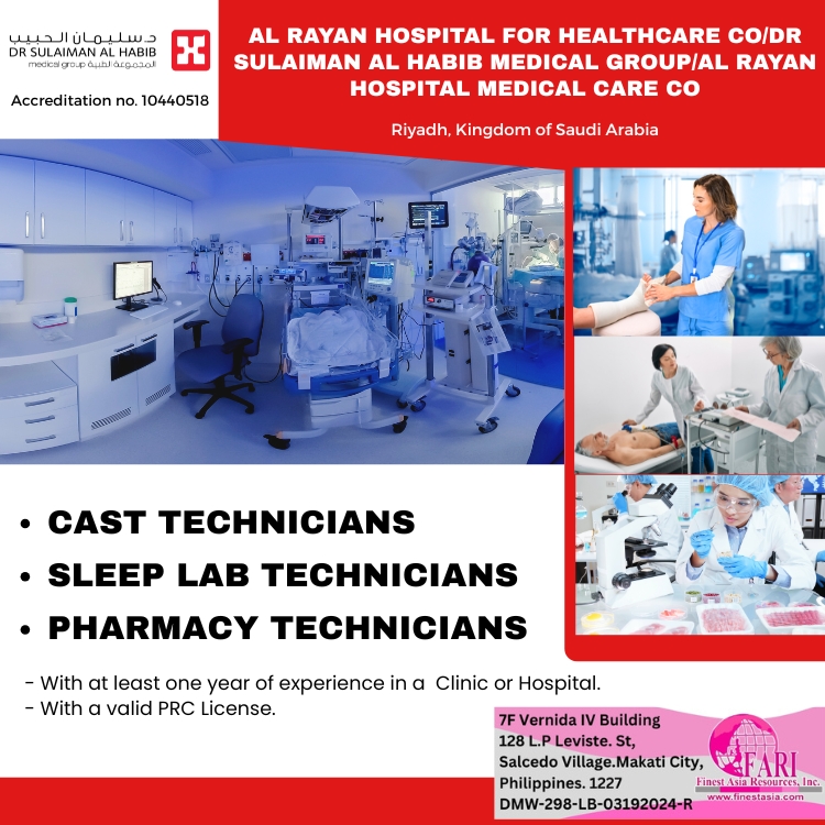 Cast Technicians, Sleep Lab Technicians, Pharmacy Technicians for Al Rayan Hospital