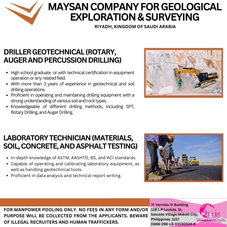 Driller Technician (Rotary, Auger & Percussion Drilling) / Laboratory Technician (Materials, Soil, Concrete & Asphalt Testing) for Maysan