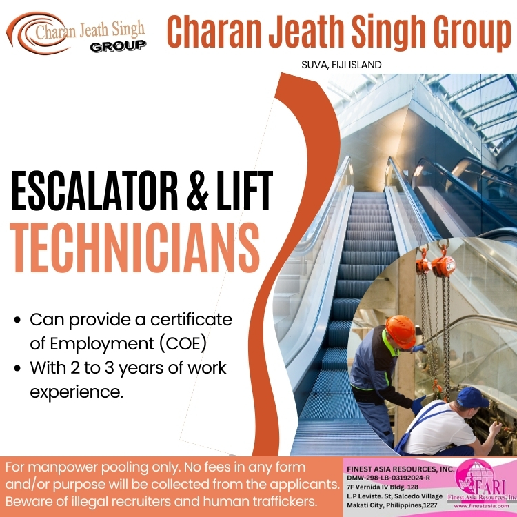 Escalator & Lift Technicians for Charan Jeath Singh Group Charan Jeath Singh Group bound to Suva, Fiji Islands