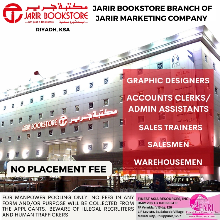 Graphic Designers / Accounts Clerks/Admin Assistants / Salesmen / Janitors / Warehousemen / Sale Trainers for Jarir Bookstore