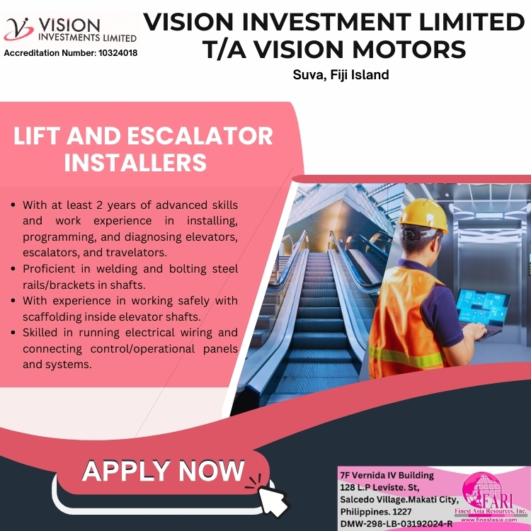 Lift and Escalator Installer for Vision Motors Vision Investment Limited T/A Vision Motors bound to Suva, Fiji Islands