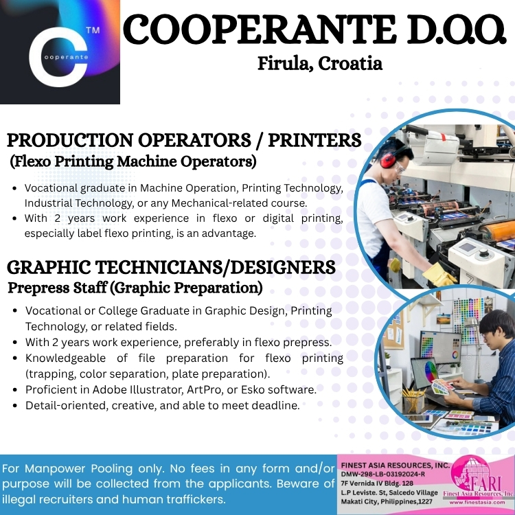 PRODUCTION OPERATORS / PRINTERS (Flexo Printing Machine Operators) / GRAPHIC TECHNICIANS/DESIGNERS Prepress Staff (Graphic Preparation) for COOPERANTE D.O.O.