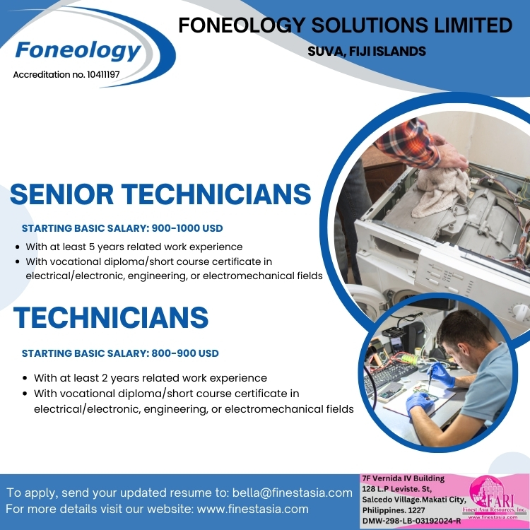 Senior Technicians / Technicians for Foneology Foneology Solutions Limited bound to Suva, Fiji Islands