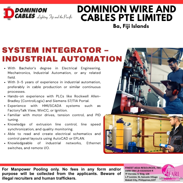 System Integrator – Industrial Automations for Dominion Wires & Cables PTE Limited Dominion Wires & Cables PTE Limited bound to Ba, Fiji Islands