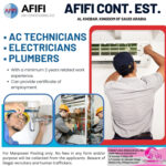 AC Technicians / Electricians / Plumbers for AFIFI April 21, 2025 No Comments AFIFI Cont. Est. bound to Al Khobar, Saudi Arabia Read More »